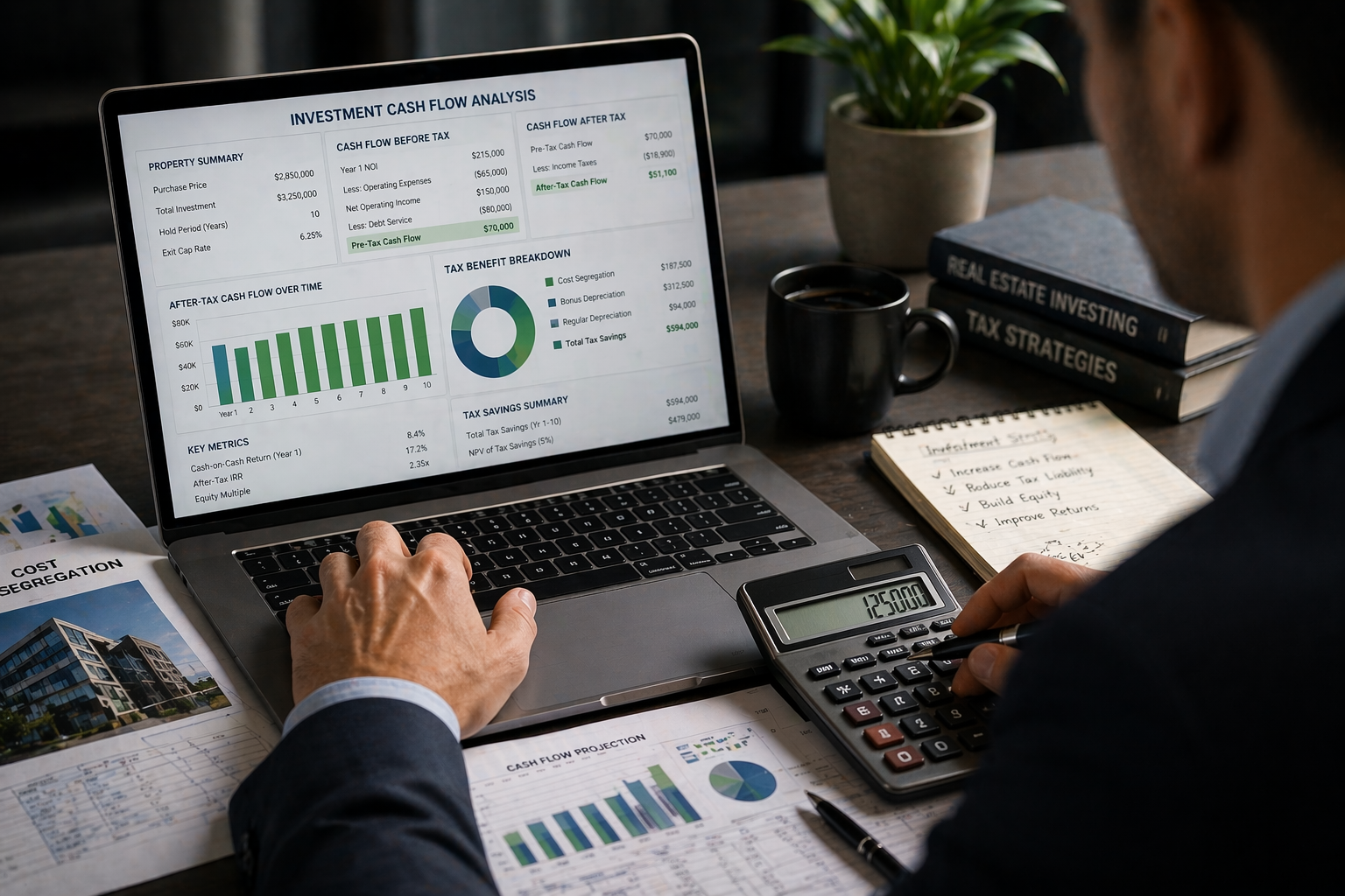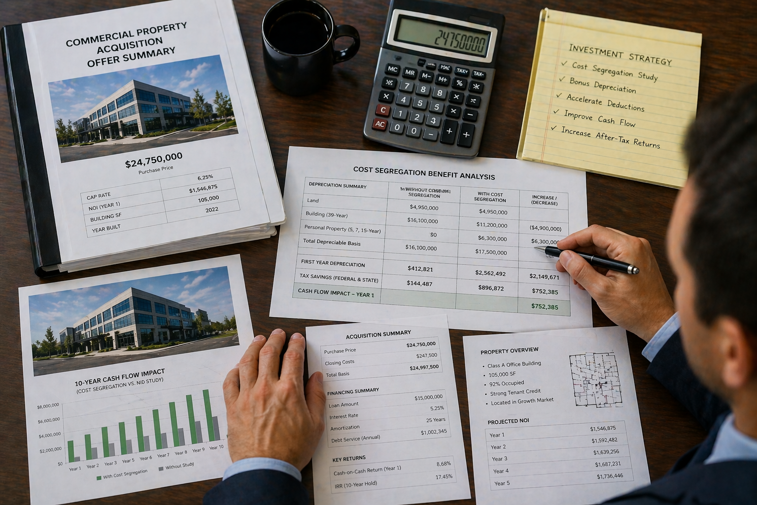 Consider a $5 million commercial property acquisition. Without cost segregation, the building is depreciated over 39 years, resulting in approximately $128,000 in annual depreciation.